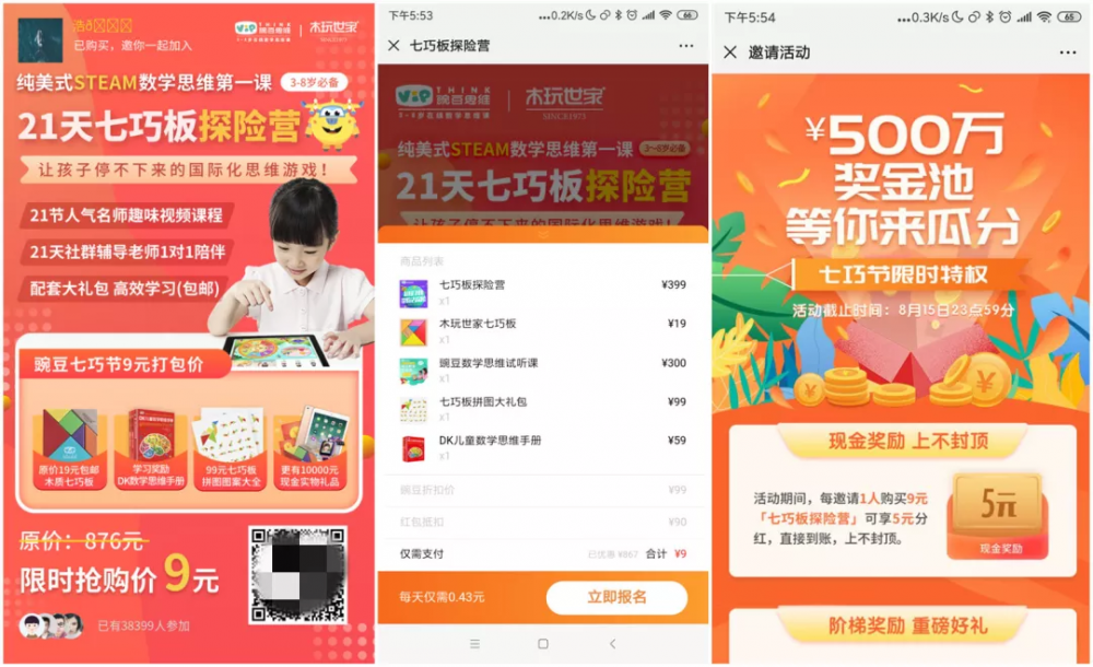1. 红包折扣:进入页面即可领取190元的抵扣红包,使用抵扣红包后,原价199元的礼包只需9元即可购买,比起显示原价和折扣对比,领取红包的互动更吸引用户。