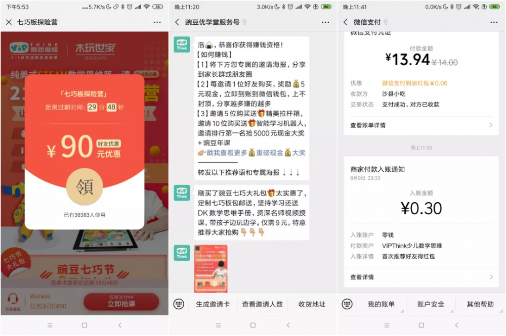 海报扫码—红包弹窗—领红包—下单优惠明细展示—付款—成功(失败—挽留弹窗)邀请好友,日赚200元—关注公众号—推送文案+海报—分享赚0.3元佣金+5元佣金