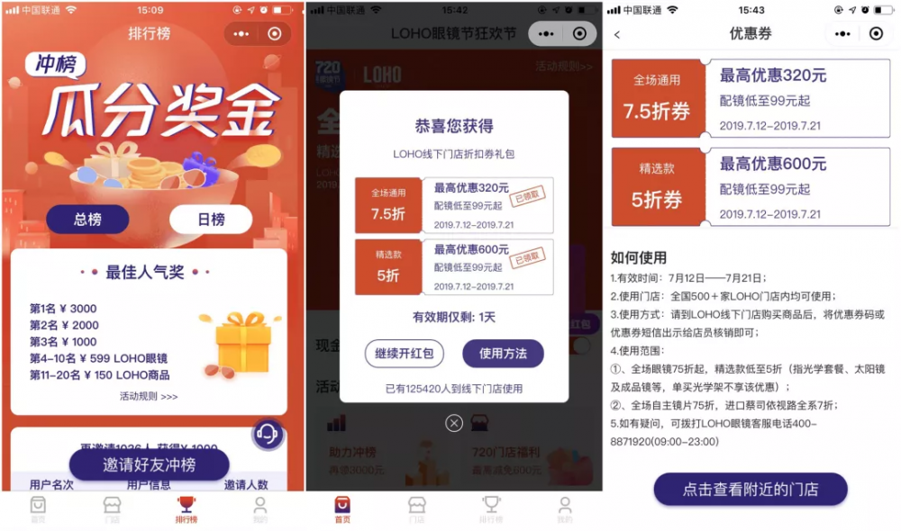 点击小程序-弹出现金红包-邀请新用户再继续开红包-免费获得720福利-线下消费转化