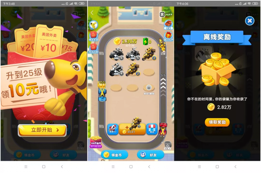 3. 将合成的袋鼠车放到赛道上跑,来赚金币,这种动态的设置会减轻单机游戏的枯燥感,以及当用户离开后再重返,会弹出离线收益,强化【回来】这个操作的欢迎仪式,加深用户对于回来即可获得更多奖励的印象,往召回设置上戳。