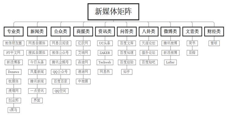 横向矩阵指企业在全媒体平台的布局,包括自有App、网站和各类新媒体平台如微信、微博、今日头条、一点资讯、企鹅号等,也可以称为外矩阵。知乎网友将常用的一些媒体平台整理归类(如图4-2所示)。
