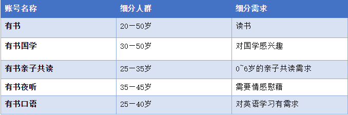 首先是同类群体的细分。有些企业运营的对象是某一类人群,例如读书类账号“有书”,用户主要是爱读书的人群,其中女性偏多,年龄范围在20~50岁。在增长期,“有书”的用户数增加后,又分化出了,对亲子阅读更感兴趣的妈妈群体;对学习口语的需求更强烈的职场类人群。于是“有书”搭建了微信内矩阵账号,如表所示。