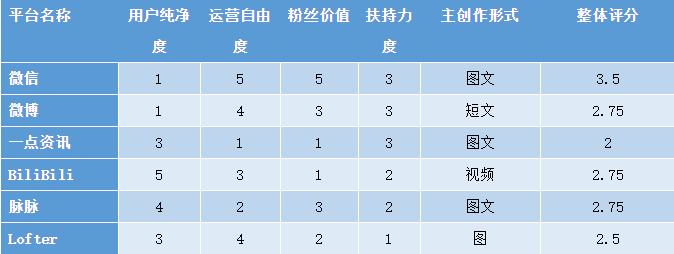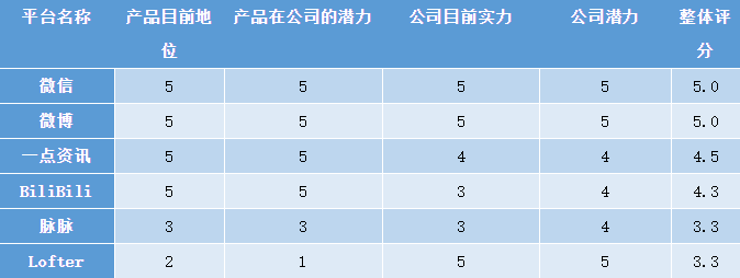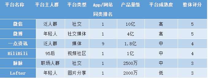 假设我们运营了一个关于年轻人图片社交的公众号,根据以上原则初步选定了微博、微信、一点资讯、BiliBili、脉脉、Lofter这几个平台。下一步需要进行复筛,找到核心运营的平台。那如何进行复筛?就需要对这几个平台进行多维度的考核,以下是我的一些经验。