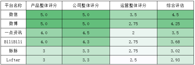 从表可以看出,评分最终明显被分成了3个梯度——4分以上、3.5分左右和3分左右(偏差±0.2以内)。评分最高的是微信和微博,分别为4.5分、4.25分;接下来是一点资讯和BiliBili,分别为3.5分、3.68分;最后是脉脉和Lofter,3分左右。