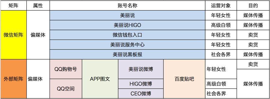 以“美丽说”为例,矩阵搭建始于2012年,外矩阵为微博和QQ空间,凭借当时QQ空间的红利期很快就吸纳超过2 000万用户,2012年末“美丽说”又开通了微信订阅号。