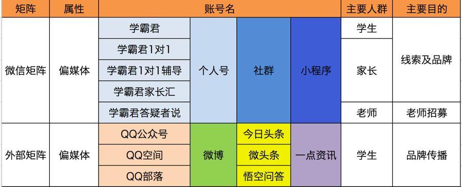 这里需要注意,新媒体矩阵是动态变化的,会随着业务的变化发现纵向、横向地加深或者减弱。比如2017年学霸君新媒体对QQ体系的支持力度减弱,后半年加强了小程序的建设。