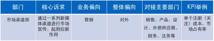 怎么理解这三个部门间的关联?通常市场渠道部负责吸引用户,品牌公关部让大家熟悉品牌,(新媒体)运营部最后进行转化。无论新媒体设在其中的哪个部门,都需要和同部门或者其他部门同事配合、协同完成整体目标。