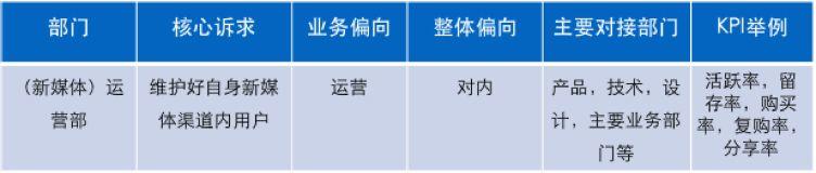 由此可见在(新媒体)运营部,新媒体的目标导向以用户维护、转化为主。