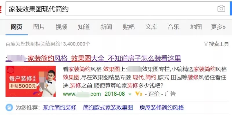 搜索“家装效果图现代简约”。搜索意图很明显,想找一些简约风格房子装修图片,首先我们可以看到在创意上和搜索词也很相符。