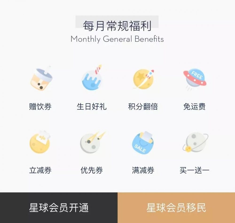 3、在会员体系上,兑现了对“喜茶GO”推出之前加入喜茶服务号会员的积分通兑。“星球移民”是对原来会员星球卡的升级,也是小程序和原有微信服务号的整合。