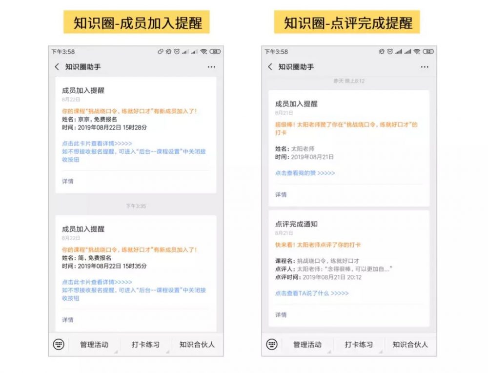 知识圈和小打卡都支持打卡提醒,不同的是知识圈可自定义打卡时间段,你可以选择每天晚上6点或者任意时间段提醒用户进行打卡,系统会在你设置好的时间段内,通过知识圈公众号推送模板消息给报名用户,点击消息之后的落地页是你当前活动的学习进度页。