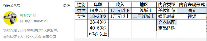 而有一个公众号叫“杜绍斐”,它就瞄准了男性用户去做穿搭建议。这样就抓住了非常多的喜欢时尚的男性,树立了自己鲜明的形象。