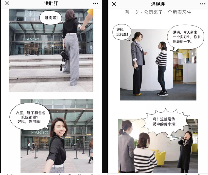还是以“洪胖胖”这个账号为例,我们平时阅读的公众号文章基本都是图文和视频,而它创造出一个新积木:真人漫画,这就使得它成功地在一些穿衣搭配账号里脱颖而出。大家看一下这些漫画,是不是感觉互动感特别强烈呢?