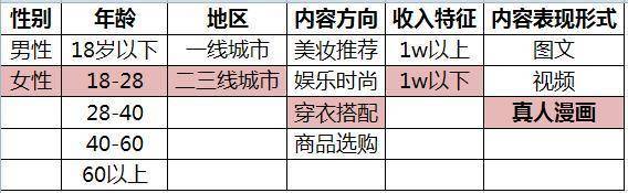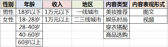 - 内容类型:这个指的是该领域的细分方向,分类标准就更丰富了,比如在时尚领域,内容就有美妆推荐、娱乐时尚、穿衣搭配、商品选购等4个方向,这样就是4块积木;