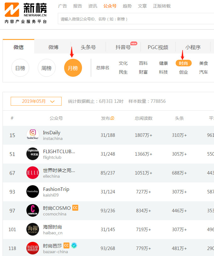 第一步:首先给大家推荐一个网站“新榜”,它是专门统计公众号排名的网站,你可以在上面查到在不同领域各大公众号的排名。以时尚领域为例,点进去找到榜单前20名的大号,再找到和你定位相近的3个账号。
