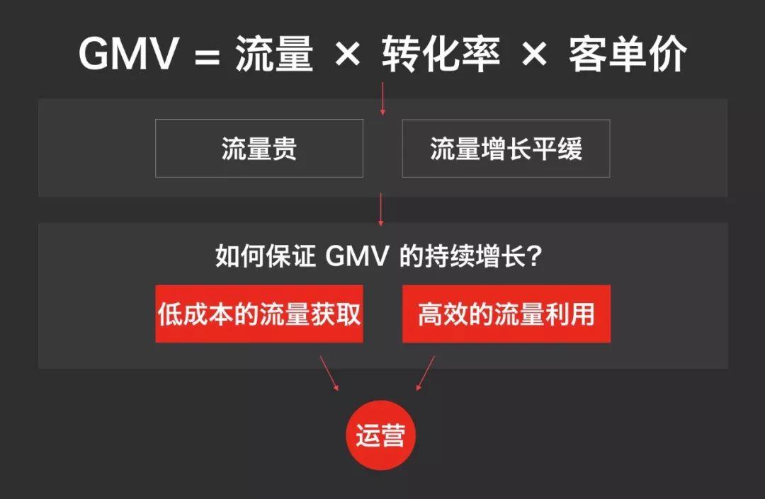 其实还是得回到上一 part 的历史发展阶段,互联网发展至今,移动互联网的红利已经释放完全;在这个背景下,流量贵 & 流量增长趋于平缓是不可避免的。对照公式来看,如何保证 GMV 的持续增长?