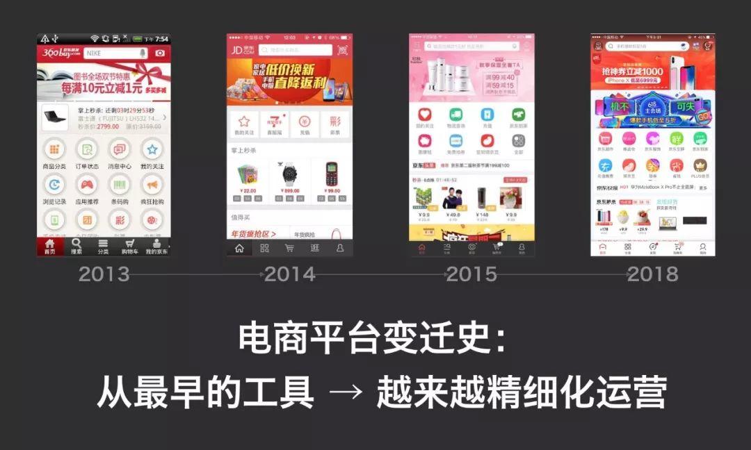 从平台的发展,也能侧面证明这个越来越精细化运营的发展路径。上图是京东首页的首屏变迁历史。可以看到,一开始的电商甚至只是一个工具集合界面,逐渐发展到现在,工具型的功能都藏在优先级更次要的地方,而把丰富的运营维度作为第一优先级,这个对流量的从粗放至精细化利用的趋势可见一斑。