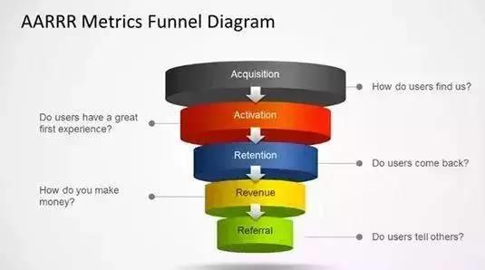 AARRR是Acquisition、Activation、Retention、Revenue、Refer,这个五个单词的缩写,分别对应用户生命周期中的5个重要环节:获取用户、提高用户活跃度、提高用户留存率、获取收入、自传播。
