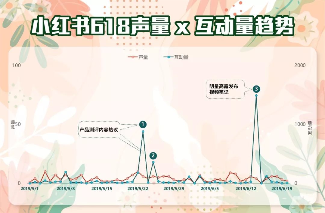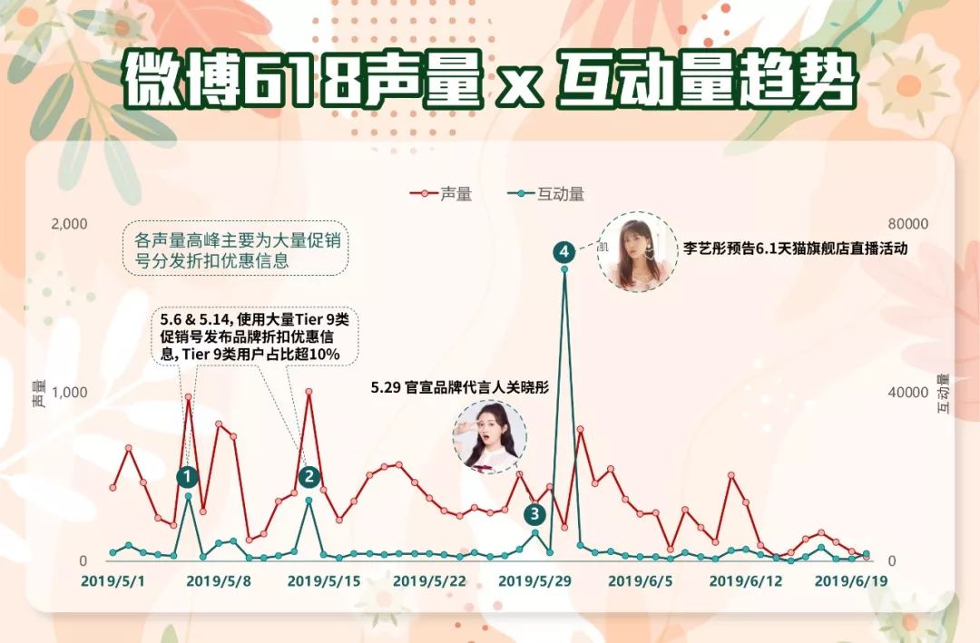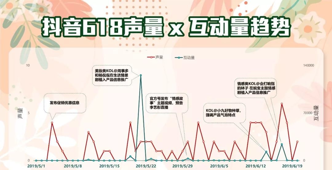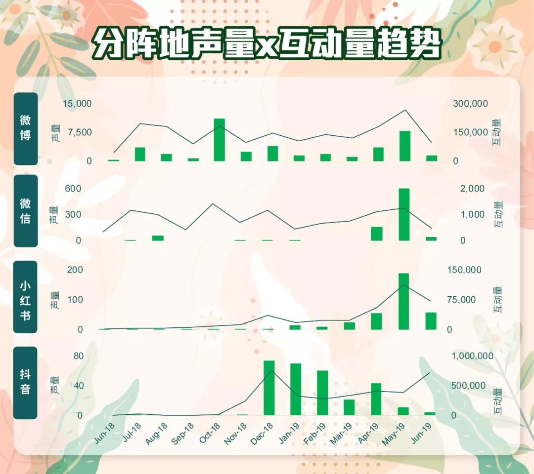 首先我们看看半亩花田整体的品牌表现:全年的声量与互动量。从2019年初开始,品牌保持着较稳定的品牌互动量,官方账号日常的良好运营,为今年618的话题高峰打好了基础。品牌表现峰值往往集中于电商平台大促前一个月,这与品牌针对年度大促的集中预热有关。