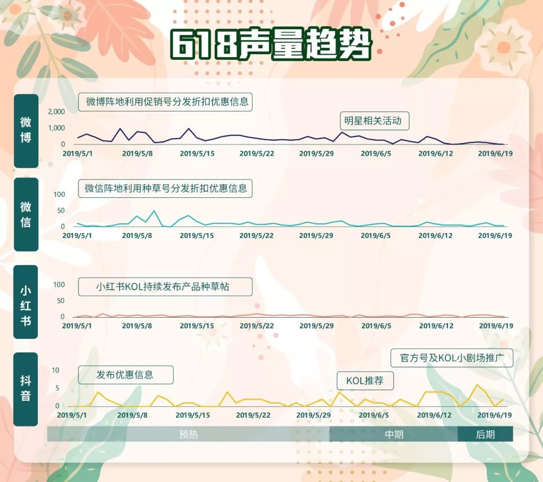 热议数据显示,在今年618电商大促的活动中,半亩花田品牌宣传在5月开始发力。双微平台采取“广铺渠道”的引流方式,集中在前两周预热期;活动中后期声量主要在抖音出现峰值,通过KOL与官方账号的集中推广,刺激活动前的用户购买欲;期间,小红书持续出现种草贴,以保持品牌热度。
