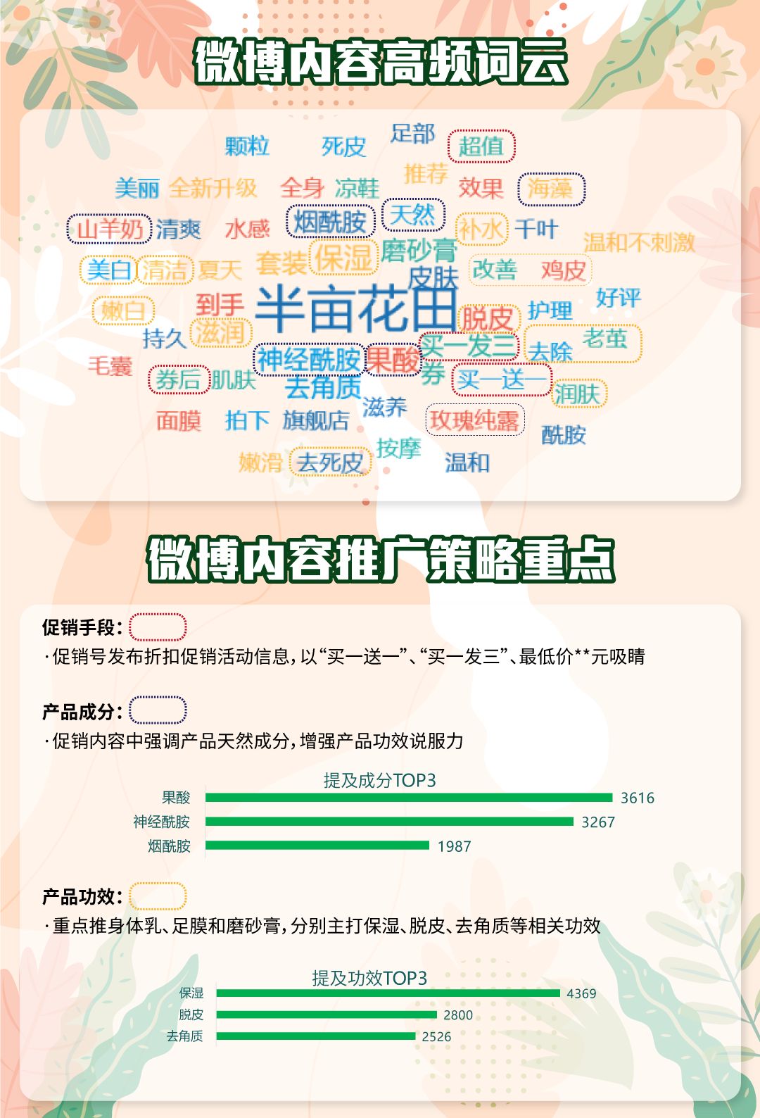 在促销内容上,微博以产品折扣为主,主推磨砂膏、足膜和身体乳。折扣优惠信息以“买一送一”、“买一发三”等字眼吸睛,同时强调产品的成分、功效特点,提高品牌认知。