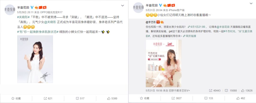 正如每个平台属性不同,不同投放渠道的KOL风格也大不相似。在明星效应让品牌销量指数级增长的微博平台,半亩花田邀请2810万粉丝的@关晓彤 成为官方代言人,1115万粉丝的@李艺彤 进行了直播。值得注意的是,明星效应亦需要与活动形式搭配,互动性更强的直播活动,与官宣代言人相比,获得了更高的粉丝反馈。
