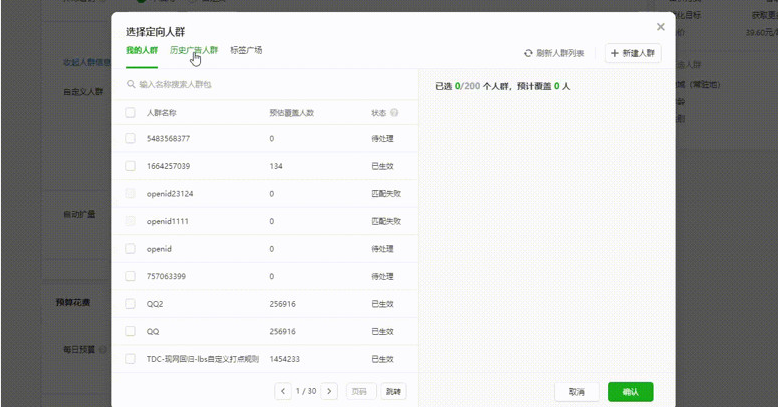 根据账户/行业/营销节点,推荐精选的数据集。客户可以在微信广告自助投放端的[自定义人群-标签广场]挑选想用的数据集,放入账户,用户广告投放