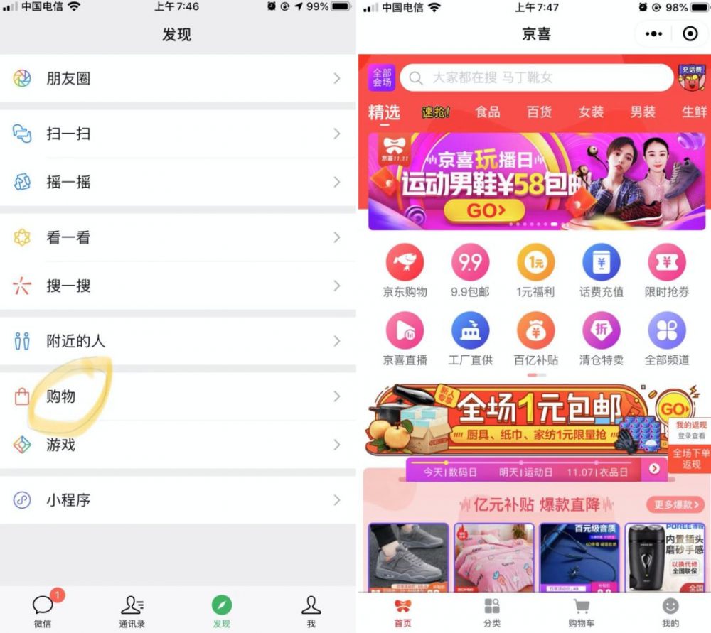 京东最让人惊喜的是”京喜”,10月31日微信一级“购物”入口从“京东H5”切换到“京喜”,象征着京东社交电商迈出跨越性一步。“京喜”是京东版的拼多多,第一天切换也创造了喜人成绩,24小时卖货6000万件,我也贡献了一单。