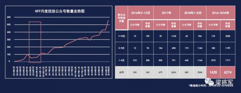 这里最典型的当属HFP。在2018年期间,他们在微信公账号上几乎每个月都有400条左右的种草文章发布。2016年-2018年之间,HFP已经在1428个公众号里投放了6274篇软文。(人工统计,可能不精准)