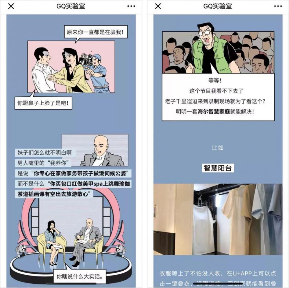 比如《情侣吵架一般会在哪一句开始动手》一文中,描写了夫妻因为晾衣服、洗碗等琐事,上了金牌调解节目表演吵架真人秀。吵到最后,一个看不下的观众怒骂道,用一套海尔智慧家庭就能解决问题,广告产品顺利出场。