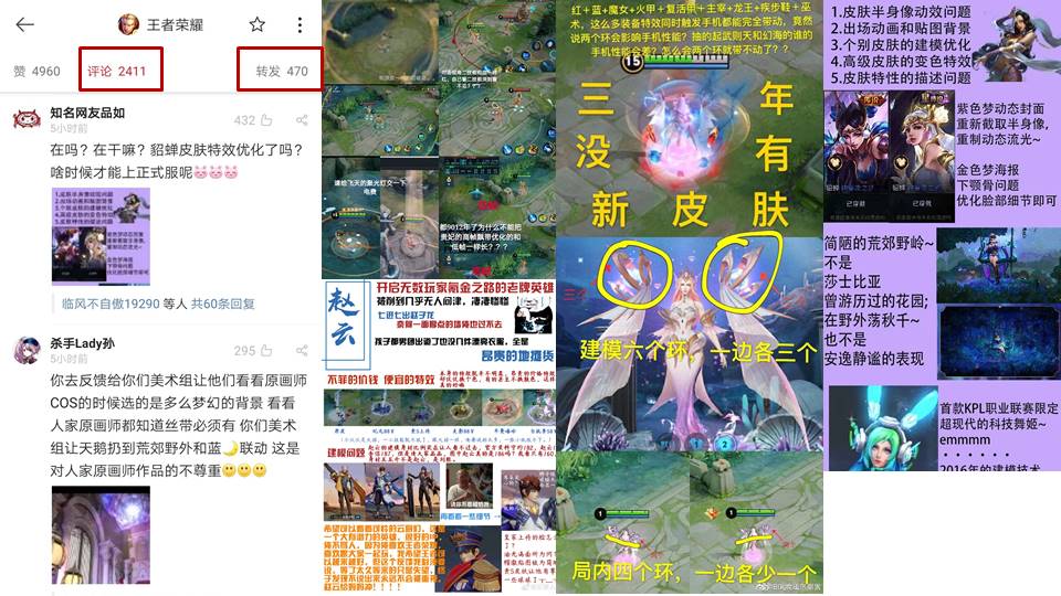但在不断推出新玩法和新皮肤的同时,要注重优化玩家的游戏体验,包括游戏匹配机制、英雄皮肤特效和建模问题、英雄技能削弱的体验问题等。比起MOBA端游的dota2和lol玩家,王者荣耀的玩家群体的女性比例更高,游戏付费意愿更高,他们享受更注重游戏美术上的细节,在“王者荣耀”官方微博的评论底下有大量玩家群体的意见反馈: