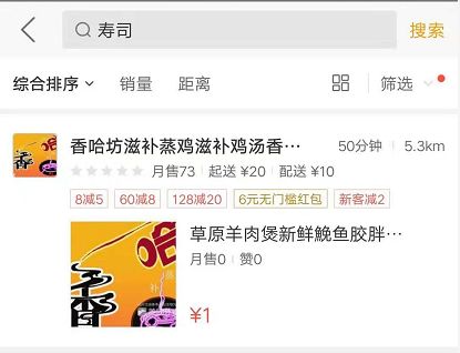 这个方法其实挺多品牌都在使用,下图这家店是卖滋补汤的,但是搜索寿司会出现他们的门店,虽然他们家并不能买到寿司。