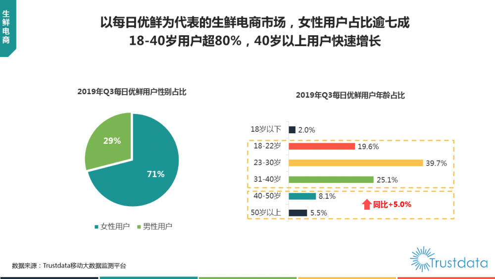 但今时不同往日。在《2019年1-9月中国移动互联网行业分析报告》中,Trustdata还指出,每日优鲜用户中女性占据7成,18-40岁的用户占比超80%,这些主力用户的消费习惯已经养成。此外,40岁以上用户也呈现了快速增长的态势,同比上涨5%,这是未来生鲜电商的增长新动力之一。