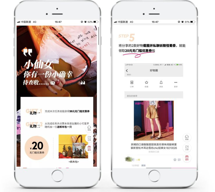 为提高曝光度,好物圈设置了好物圈推荐有礼的活动,粉丝将购买任意2款订单或收藏分享至好物圈后,截图给客服,就可领取优惠券,并有机会获得帆布包奖品,提高了粉丝的分享意愿,通过圈组裂变,提高了转化率。