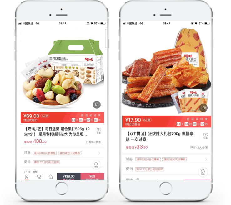 拼团:双十一期间,为提高小程序商城的曝光,提高关注度,百草味开启了2人团和3人团,价格差异可以刺激用户掏腰包购买、组团裂变,为百草味带来新流量的同时,也带动了商品销量,提高双十一期间营收。