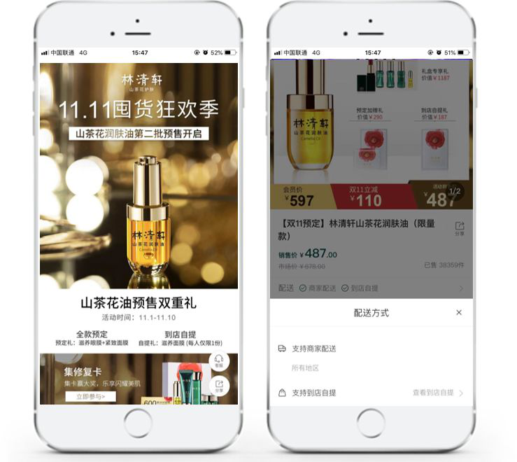 林清轩的微信小程序双十一活动自11月1日开始,活动以“预售+礼盒专享礼+到店自提+187元自提礼”为主要形式,在推广上,以导购为核心。线上,通过微盟导购App助手推送活动信息;线下,引导门店客户扫码等方式,为活动带来大量流量。活动上线2小时,山茶花润肤油销售突破2万瓶。