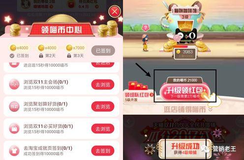 每天喵铺都在自动产生喵币,点击【领喵币】,通过做任务,还获得更多的喵币,用于升级喵铺。喵币达到一定数量,点击【升级领红包】通过升级喵铺,可以获得双11兑换红包。