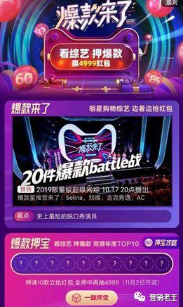 消费者互动:消费者在爆款清单界面上进行押宝,选出心仪爆款。11月1日将举办直播盛典,选出年度10佳爆款,在手机淘宝端最终全部押中的最终10款爆款的消费者可赢得超大福利红包。