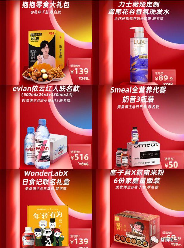这次“天猫红人”联合淘宝第一主播薇娅、时尚博主周小晨、美妆博主小猪姐姐、美食博主密子君、大胃mini、日食记推出联名定制款。合作的品牌有百草味、力士、依云、IPSA、南街村、霸蛮、smeal、wonderlab、金字火腿等。