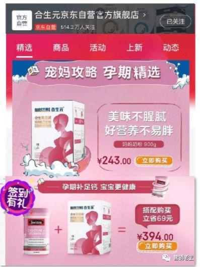 H&H(健合)集团,旗下拥有合生元和Swisse品牌,整合旗下Swisse孕妇钙和合生元孕妇配方奶粉,为孕妇妈妈解决孕期营养摄入问题,推出跨品类套组: