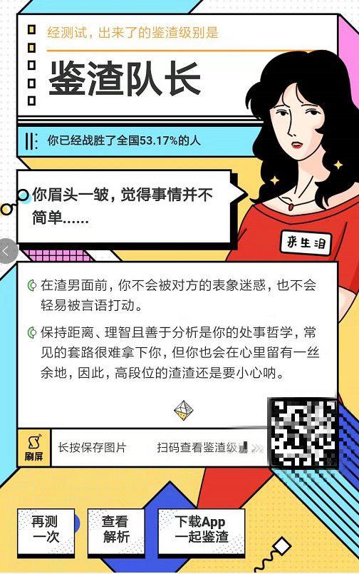 举个例子,我司团队曾策划了《渣男渣女鉴渣测试》。在结果页上,并没有一次性给出测试答案,反而需要用户下载 APP 才能查看全部答案。