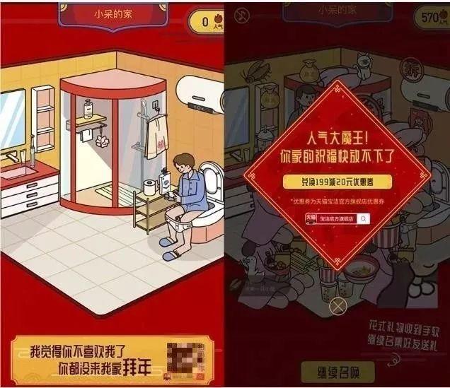 以《宝洁 P&G:过年别再给我送男朋友了!》为例,整个 H5 是典型的场景布置设定,用户根据个人喜好装扮自己的家,满意后分享到社交媒体,再邀请好友给自己送礼物。
