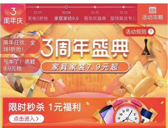 “我真的really不是特别在乎你几周年庆,你左上角的标签已经无时无刻不在提醒我了,现在我最需要知道的难道不是你在卖什么产品的页面,促销力度如何,有什么主打商品吗?”