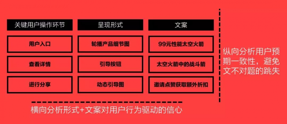 3.整体审视提炼表格,打磨和评估用户预期的一致性,保证用户从始至终精力聚焦在一件事情,你才能够有效的引导用户往下走。(不要指望你用1元抢购的广告引进来的用户会沿着你全场五折的按钮往下走)。