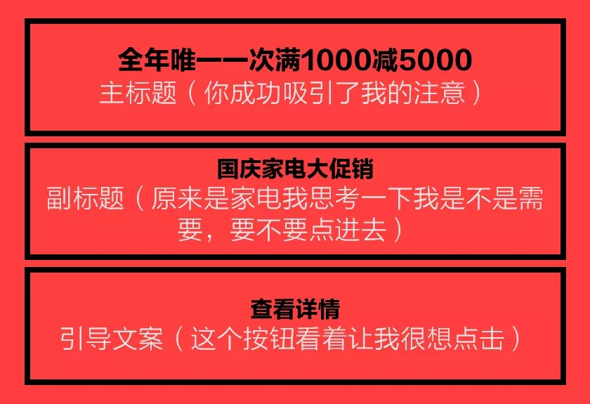 我为什么要看你(吸引注意的噱头) + 你到底是个什么(活动主题解释-由页面主标题承接) + 我想要点你(点击引导,多种形式,常见是一个极具点击感的按钮;一个小经验:在无线端由于点击操作是手指而不是鼠标,符合手指形状的圆形按钮会更有点击欲望,实测大概高出20%左右)。