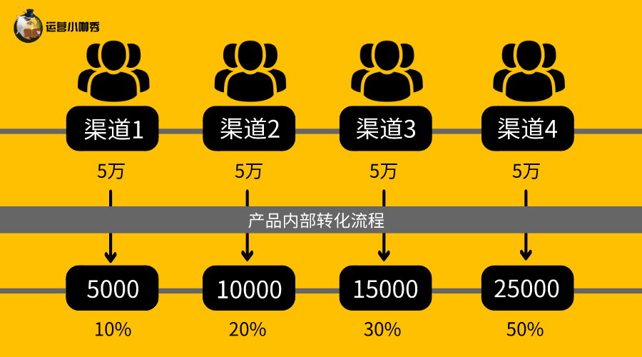 我们假设四种渠道,在资金人力投入相同的情况下,都能拉到5万用户。从转化率的角度考量,渠道一的转化率为10%,渠道四的转化率为50%,通过对比,我们应加大渠道四的投入,减少渠道一的投入的。
