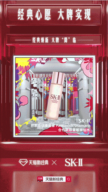 SK-II神仙水、资生堂红腰子、雅诗兰黛小棕瓶等16款经久不衰的单品再次出现在大家眼前。天猫邀请艺术家妙笔生花,为这16大品牌和单品制作了色彩绚丽的动图海报,一睹经典好货摇身一变、华丽焕新。