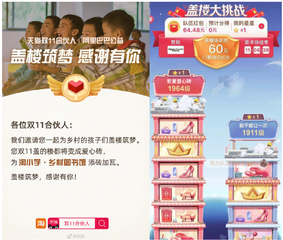 许多双11合伙人响应阿里巴巴公益号召,努力盖楼、搬爱心砖,为“淘小学·乡村图书馆”助力。