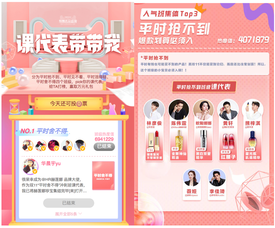 在10月中旬的美妆洗护“预售选品盛典”活动中,天猫按商品属性划分出“平时舍不得”、“平时见不着”、“平时抢不到”、“平时活得糙”四个班级,集结王一博、华晨宇、林彦俊和彭昱畅四位课代表,号召粉丝为各自的爱豆打榜。最终,华晨宇登上热度TOP1,为他打榜的粉丝便有机会获得万元美妆个护大礼包。