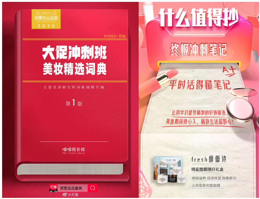 除了这四位课代表,天猫还邀请了孟美岐、黄明昊、鞠婧祎、俊平大魔王、张大奕、李佳琦等24位具有影响力的名人参与打榜。并为“大促冲刺班”的同学们编写了《美妆精选词典》和“急救小抄”。